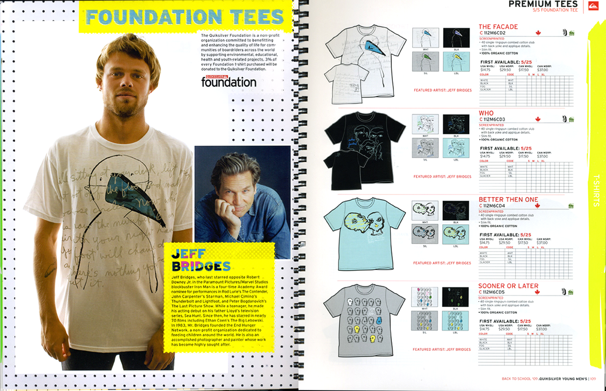 led to a creative collaboration that caught nearly all of Quiksilver off guard — because it didn't come from Marketing. It came from the art department. Working from Jeff's personal sketchbooks, I art directed a tee collection rooted in his life as a surfer, artist, and Santa Barbara local. The campaign included a photoshoot featuring Quiksilver's top skate team — including Reese Forbes — wearing the collection. The shirts hit retail, sold well, and benefited the Quiksilver Foundation.
